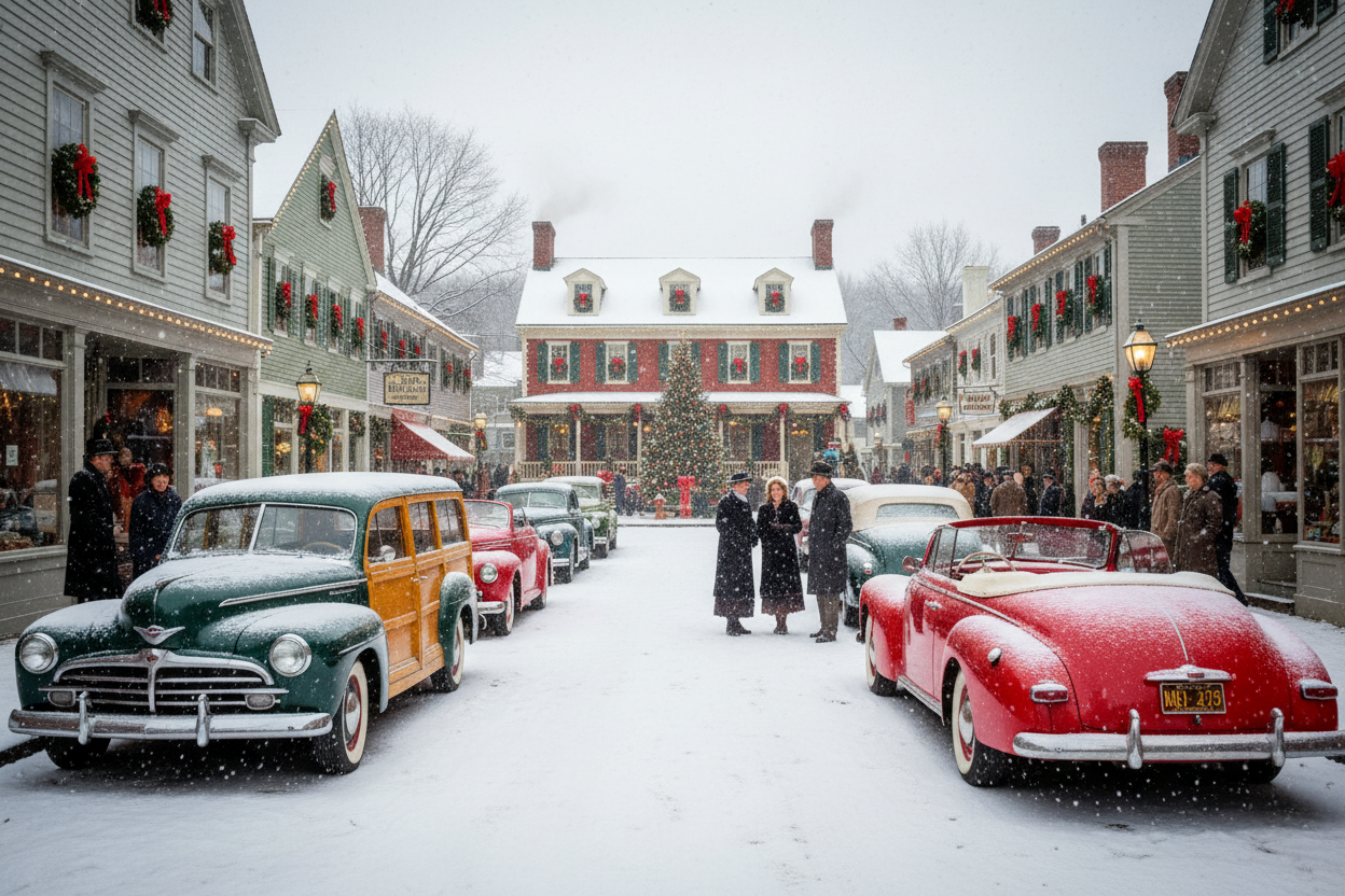 Festive Lights and Decorations: The town’s Main Street is decorated to look exactly as it did in Rockwell’s painting. You’ll see vintage cars parked along the street, shop windows decorated with classic wreaths, and simple, elegant lights that enhance the historic architecture without overwhelming it.